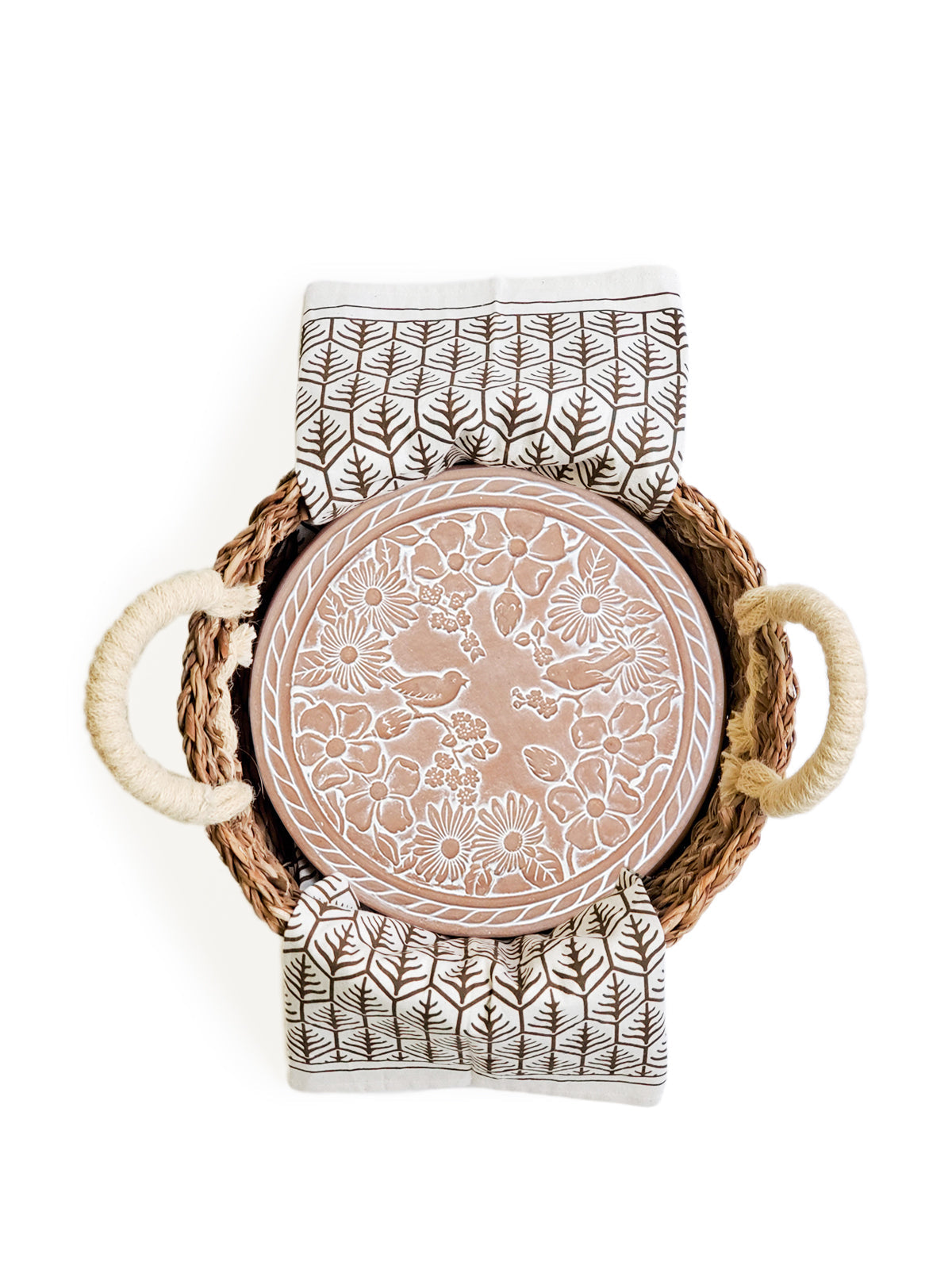 Add a bit of artisan-inspired style to the kitchen with a terracotta bread warmer and hand-screen-printed tea towel. Engraved with garden design and cut to fit neatly into a round basket, this terracotta special bread warmer is naturally insulating, and the basket itself has been handwoven from sustainably grown seagrass. The tea towel is great for drying dishes or hands in the kitchen, lining a bread basket. They are the best gift items for anyone who loves bread!